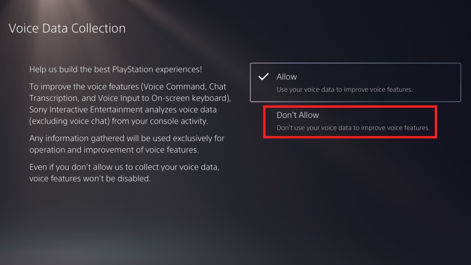 Next, you'll want to head to Settings > Users and Accounts > Privacy > Voice Data Collection and switch this over to the "Don't Allow" option. By default ("Allow"), Sony will be able to analyze all of your voice interactions with the system to help improve its services. It's worth noting that Sony says even if you choose the Don't Allow option, voice features won't be disabled.