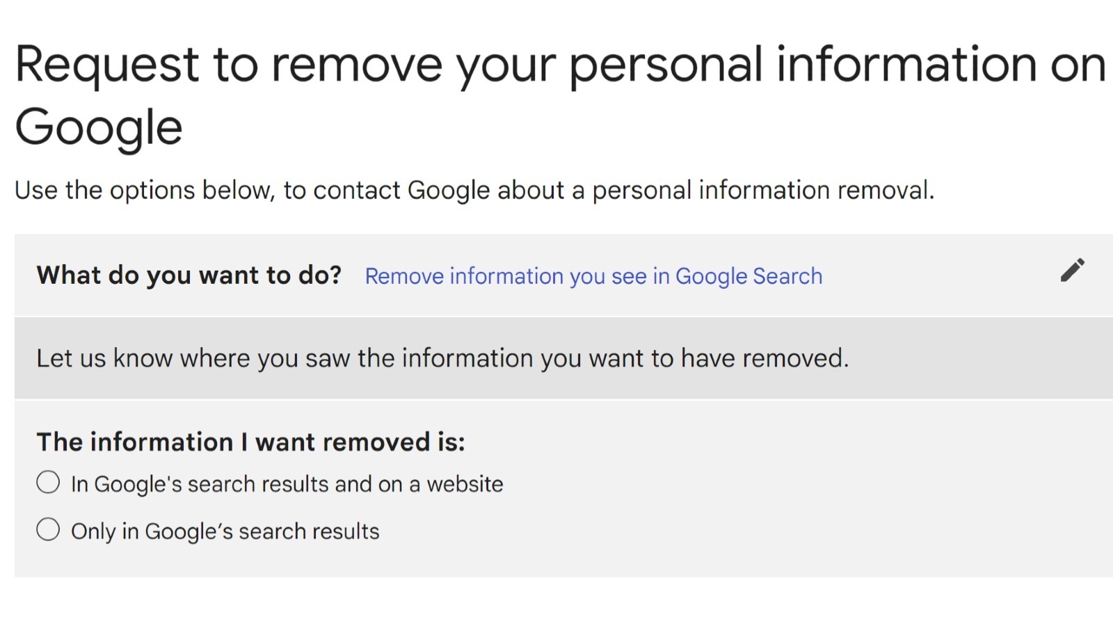 - Pick the type of personal information you'd like removed from Google Search results.