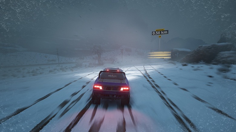 This digitized natural beauty is enhanced by the dynamic lighting and weather system. The dunes and palm trees look especially gorgeous at sunset. Some events will have you racing under the cover of night, through a thunderstorm, or a blizzard. These all limit visibility and add to the sense of danger. Sometimes, a massive sandstorm will roll in from the horizon and threaten to sweep away the entire field of racers. That's when things get really exciting. Visual effects like lens flares and water droplets sticking to the game's camera help further the immersion. The physics of sand is particularly detailed, with your tires kicking up particles and leaving realistic track marks as they go.