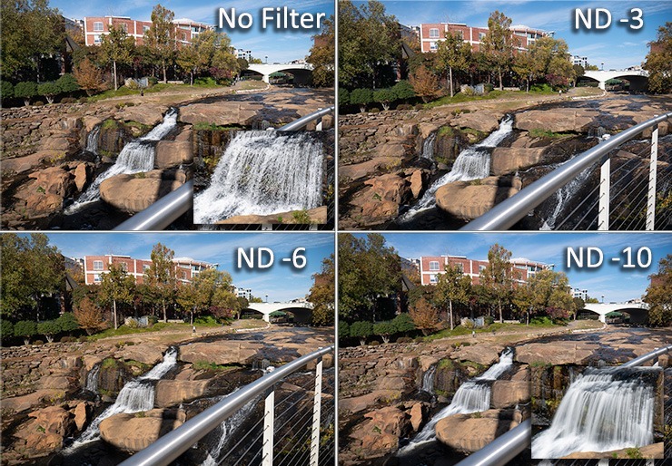 You can most obviously see this effect when it comes to waterfalls. The bare lens renders the waterfall as individual droplets but gets smoother and smoother and each successive strength of ND is applied. At ten stops, any tiny shake of the camera will produce blur in the image, so a tripod is absolutely required. In-body camera stabilization will also be a plus.