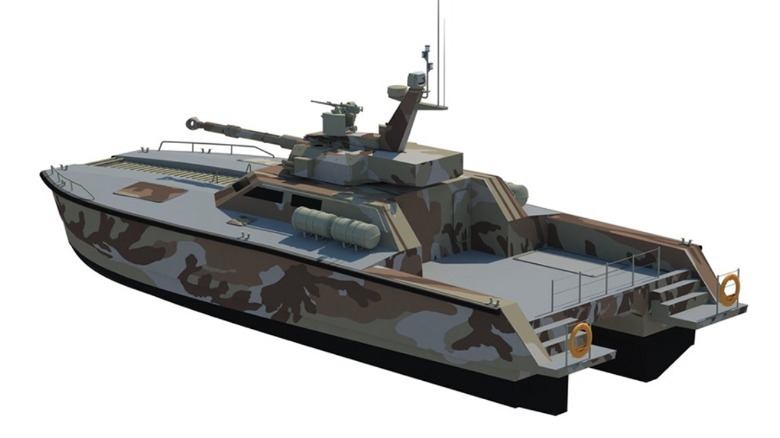 The six-person crew "tank" variation of the Tank Boat consists of a Cockerill 105-millimeter cannon on a rotating turret capable of launching anti-tank missiles and conventional 105-millimeter shells. It's not quite the firepower seen on an M1 Abrams tank or a Leopard 2, but it's no slouch. The five-person crew troop transport model is armed with a Northrup Grumman Mk44 30-millimeter cannon. Power is supplied by two 1,700 horsepower V12 diesel engines supplied by MTU, a subsidiary of Rolls-Royce. Those engines reportedly allow the vessel to reach a top speed of 40 knots. Both versions are twin-hull catamarans with the tank variant measuring just under 60 feet long and the troop transport vessel measuring at just over 61 feet long. It can hold upwards of 60 soldiers in the troop transport spec, and 20 troops in the tank version. The vessel contains all manner of modern radar equipment, radio communication devices, autopilot, and a weather station.