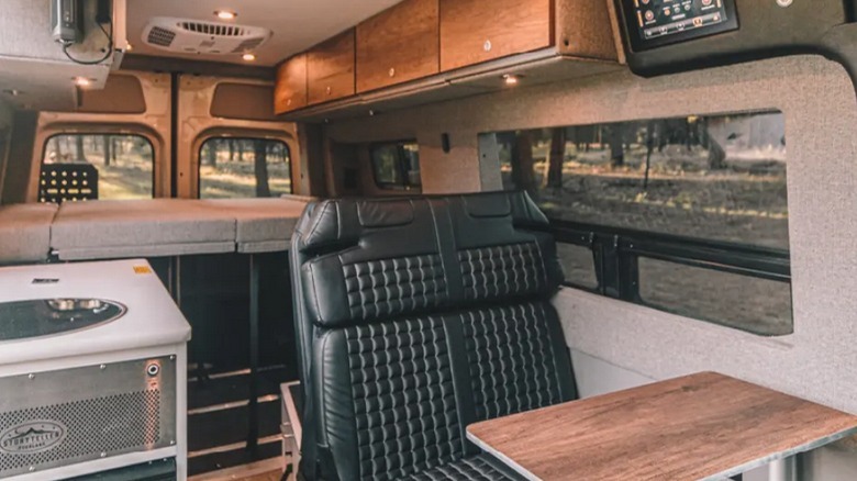 If you're looking for something that's a little more rugged in a campervan, Storyteller Overland's Beast Mode will definitely fit the bill. Its all-wheel drive Mercedes-Benz Sprinter chassis — with off-road wheels and tires — begs to be driven in the dirt so you can get to the best camping areas. It's got a modular roof rack, a side ladder, and a rear-door setup that features a lockbox for storage. It even has a side-mounted surfboard holder if you like to carve it up in the surf.