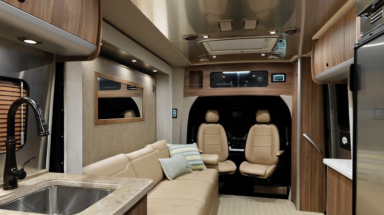 Airstream has been known for decades because of its retro, yet impressive silver trailers, but its Atlas campervan is truly a sight to behold. It's built on the Mercedez-Benz Sprinter chassis, and has a power slide-out section that you can use to give you more room in the cabin while parked. It has an expansive three-person couch, swivel chairs up front that can turn towards the cabin for more seating area, and it has a sink and two burners for cooking.