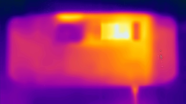 Even pushing the Legion Go to its limit, it remained quiet and comfortable to hold. At worst, it emitted a constant whoosh of air, but the volume and quality of the sound were never offensive, even in a quiet room. This became all the more impressive when we took a look through a thermal camera and found that temperatures were very well controlled. Most of the Legion Go barely heats up at all, and there's really only one major hotspot in the upper left-hand corner of the display. From the front, this never exceeded 114.8 degrees Fahrenheit (46 degrees Celsius), while it hovered around 149 degrees Fahrenheit (65 degrees Celsius) when measured on the back panel.