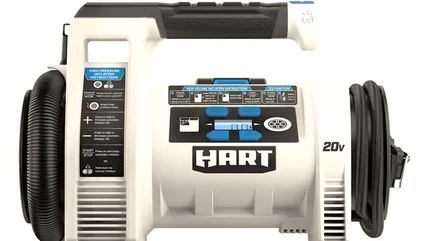 Per Hart's online retail store, the pistol-gripped tool can push up to 150 PSI of pressure, meaning it can inflate many car tires from flat to full in about seven minutes. It also comes with a digital LCD display offering an accuracy range within 1 PSI and a 20-inch hose that makes it easier to get to harder-to-reach nozzles. As the name notes, the tool operates on a 20v rechargeable battery. While the battery and charger are sold separately from the inflator, it will work with other 20v Hart tools, and that will be good news for fans of Hart's cordless tool line.