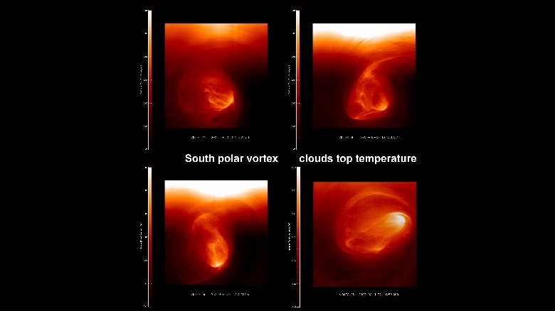 Venus spins backwards compared other planets. Despite its slow rotation, the planet's winds "super rotate" in the upper atmosphere — circling the entire planet westward in 4 days, at speeds up to 250 miles per hour — faster than an Earth hurricane. Venus, like many planets in the solar system including Earth, features swirling polar vortices akin to hurricanes. However, the over 1200-mile-wide double-eyed southern polar vortex on Venus is different — it's the most unstable and variable. Observations show that the southern polar double vortex is an extremely complex storm with a core shape that can quickly change in less than 24 hours. There's thought to be a similar system at the north pole.