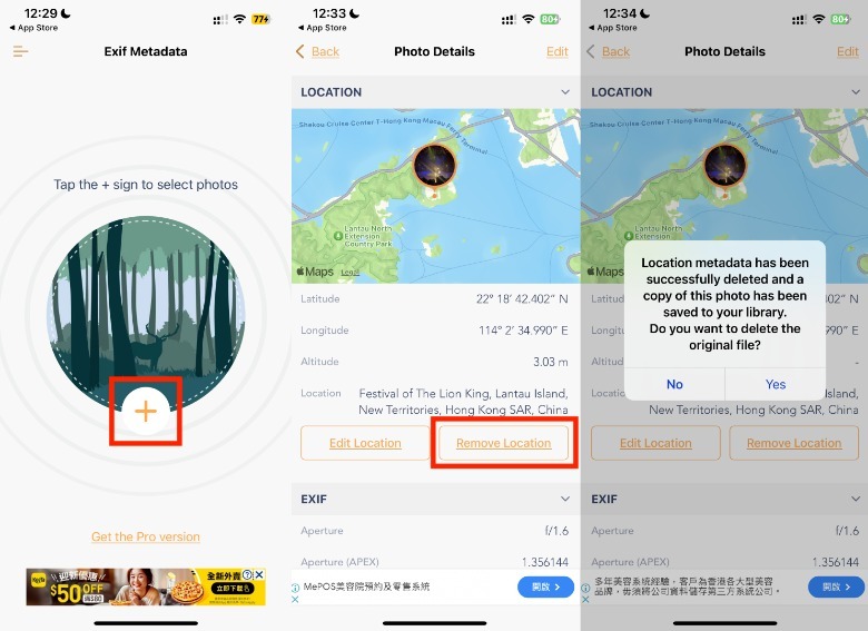 In the pop-up provided, tap "Yes" if you wish to delete the original file with the location metadata details. If you want to keep the original photo with location details, tap No.