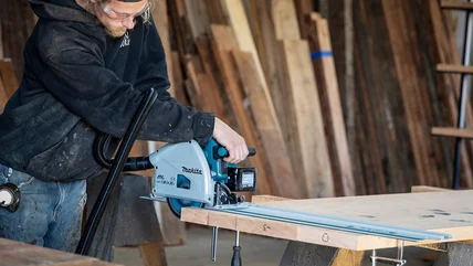 The guide rail, one of several Makita tools you'll want for DIY carpentry projects, comes equipped with rubber strips along the bottom that help prevent sliding. However, you'll need to ensure your cutting surface is debris-free before placing the rail down. You will want the side with the splinter guard (a small rubber strip along the edge) placed at the cut. The splinter guard helps create a cleaner cut by pressing down along the edge during cutting, keeping the fibers of wood from pulling away from the material. One way to ensure a clean cut through tough material is a fresh blade. You can check out our saw blade buyer's guide to help you choose the best option for your project.