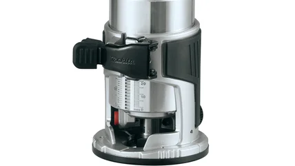 Having the right bits and guides is an absolutely necessary start to any woodworking job requiring a router, but matching the correct base to your particular task will help things go as smoothly as possible. Makita has more than a half-dozen bases and handle setups for you to choose from, including fixed, offset, and tilt bases. The plunge base shown above allows you to cut at depths of up to 1-3/8 inches, and has three individual stop screws. There's a plunge lock lever to speed up your work, and you can mount template guides to the sub-base to keep you on track.