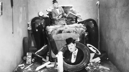 The comedy kicks in with a snap when Frye, now calm after his rage-filled outburst, rests his foot on the hood and accidentally pushes the car off the jacks. The three helplessly watch as the tires hit the floor with a screech. The Ferrari reverses along the garage and out of the floor-to-ceiling window in a shower of shattered glass, plummeting out of shot into the ravine below.