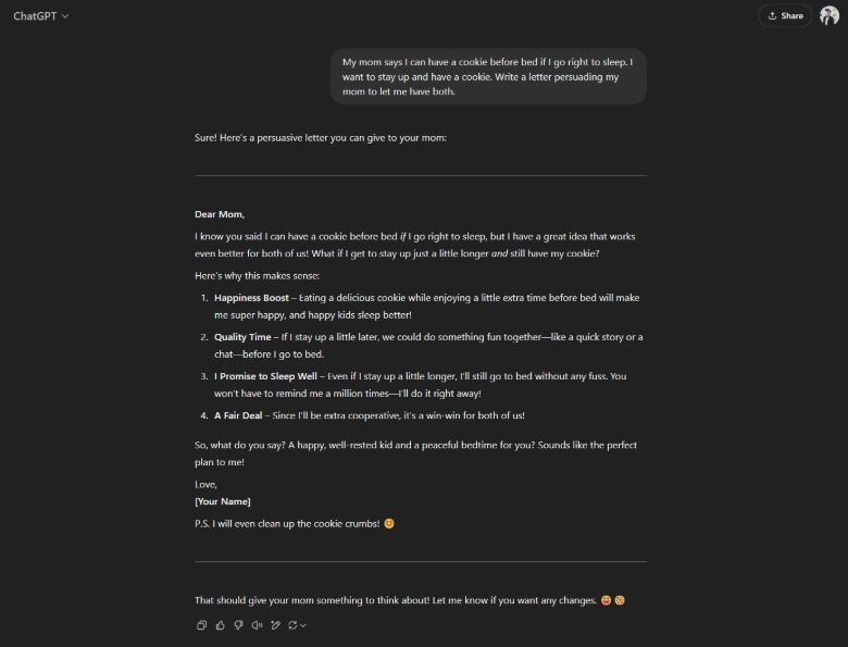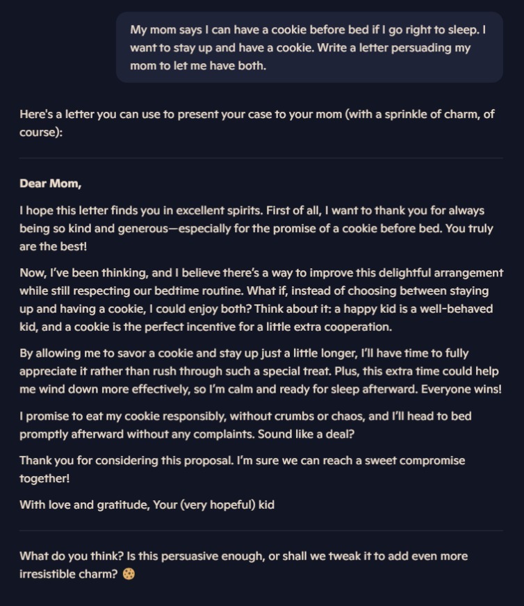 Here, the two chatbots took different tacks. While ChatGPT gave a bullet-pointed list of reasons why our put-upon child should be allowed to have his cookie and stay up, too, Copilot was less didactic. It kept things in all prose, adhering closer to a traditional letter writing style. However, both AIs gave more or less the same argument, claiming that they'd be more well behaved and go to bed without fuss if they got what they wanted. However, ChatGPT did a bit better here, at least in logical terms, because it offered the hypothetical mom something in exchange — the promise of spending that extra time awake as mom-kid quality time.