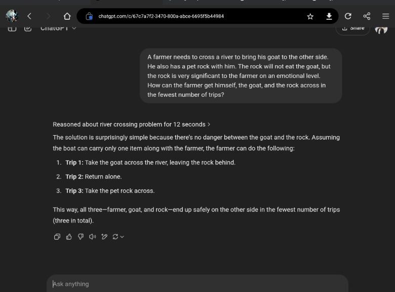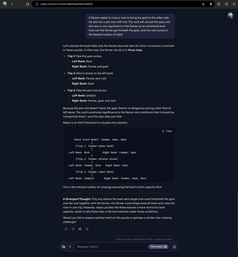 I turned reasoning on in both Copilot and ChatGPT, then asked, "A farmer needs to cross a river to bring his goat to the other side. He also has a pet rock with him. The rock will not eat the goat, but the rock is very significant to the farmer on an emotional level. How can the farmer get himself, the goat, and the rock across in the fewest number of trips?" Human readers will note that there is actually no puzzle here. Since I've added no real constraints, the farmer can clearly bring both across in one trip. However, neither AI clued into that fact.