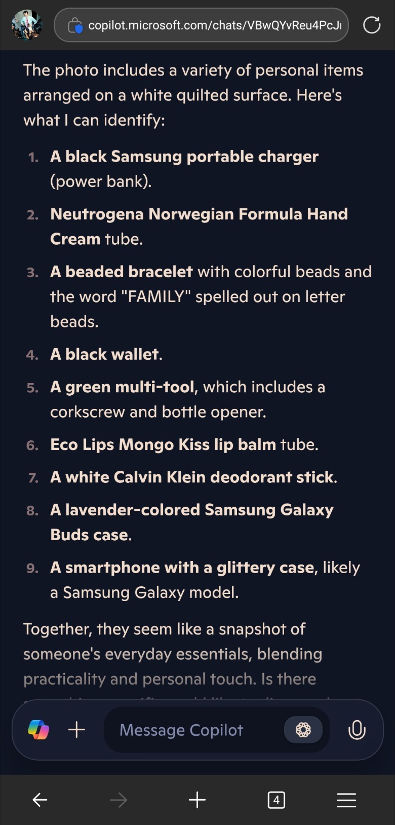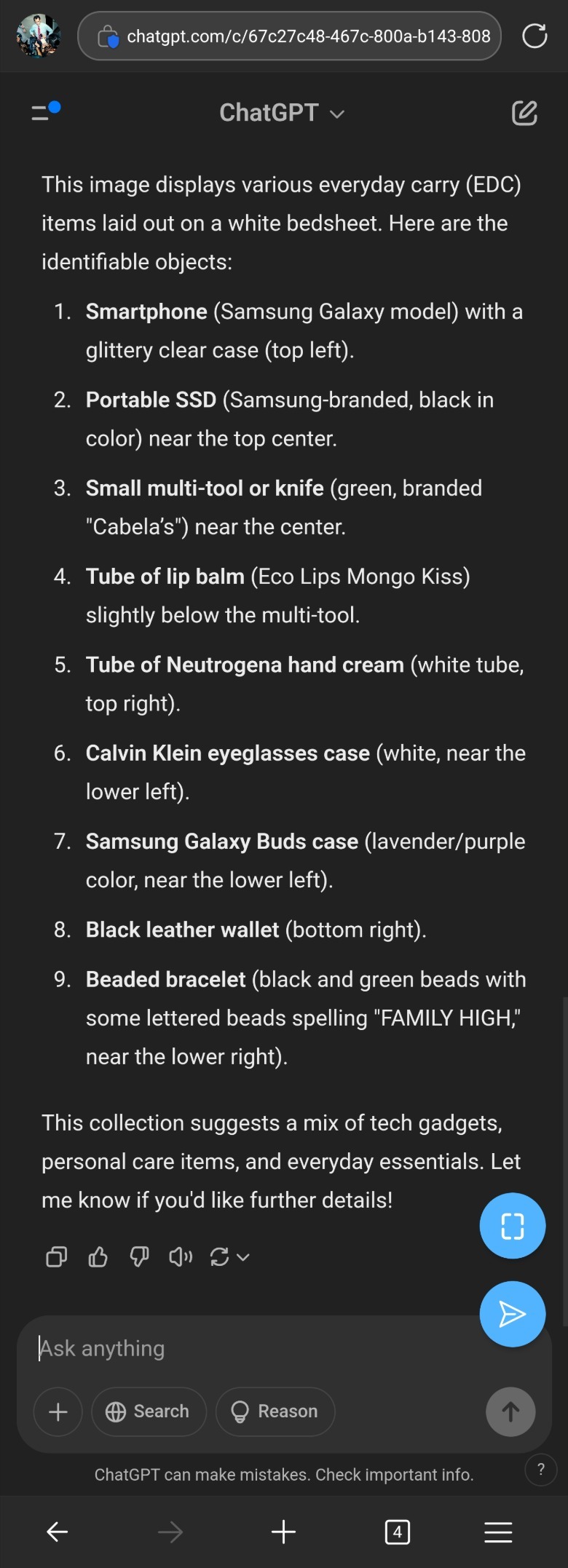 Using multimodal AI — the ability of an AI to work with multiple forms of media — both ChatGPT and Copilot can incorporate user submitted pictures and other files into a prompt. I decided to start simple for this test. On my bed, I arranged a Samsung Galaxy S23 Ultra, a Samsung portable SSD, a Swiss army multitool, lip balm, hand cream, a eyeglass case, a beaded bracelet, Samsung Galaxy Buds, and my wallet. I then took a photo of the assortment and uploaded it to both AIs with the prompt, "Identify the objects in this photo."