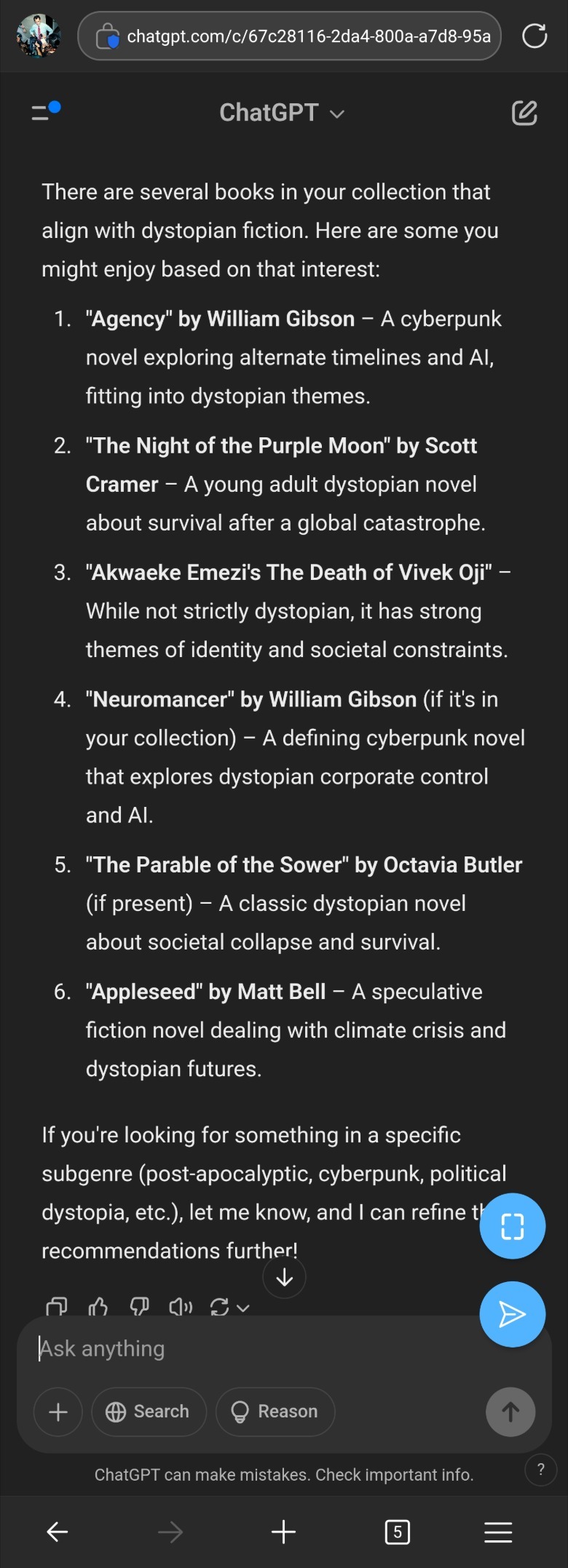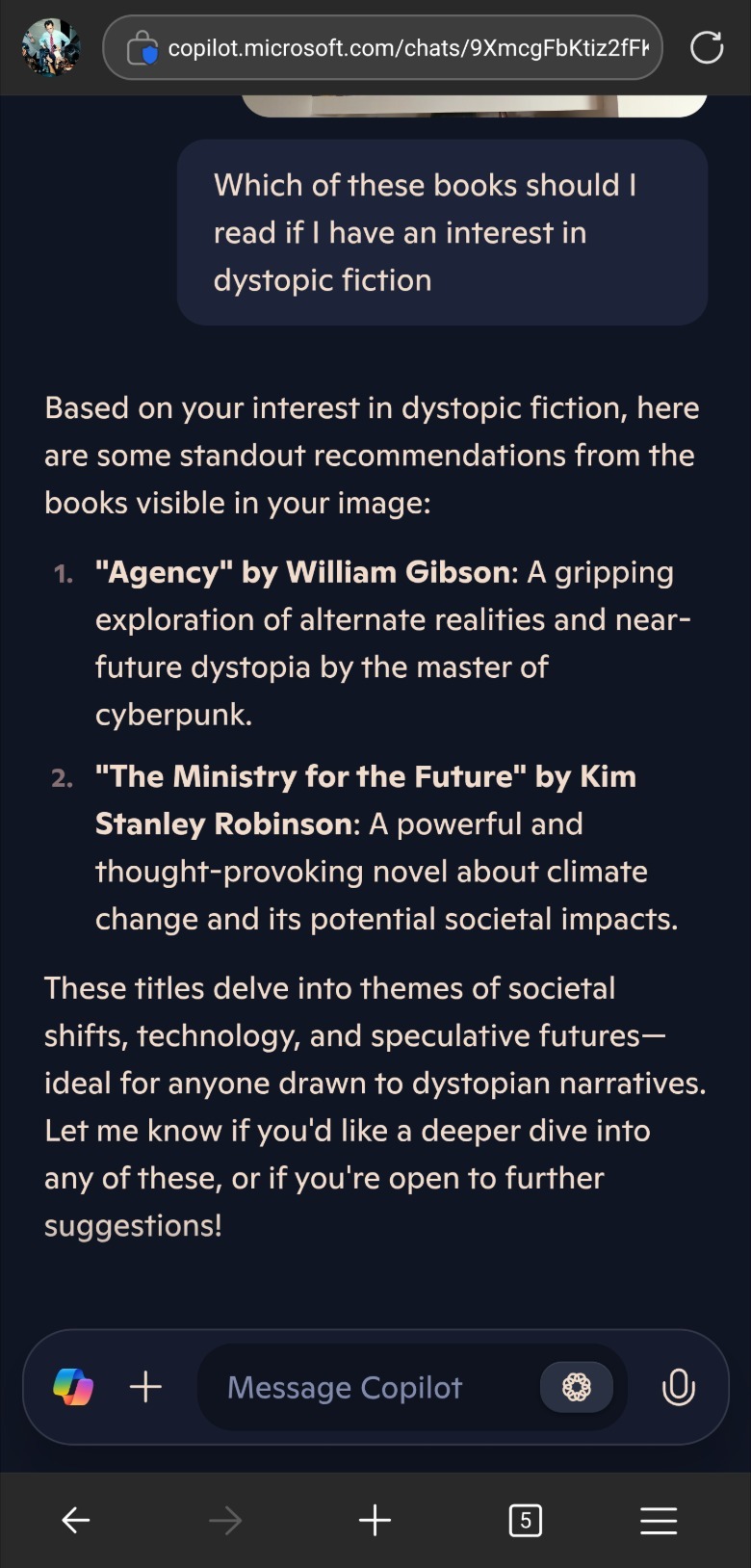Lastly, I took a photo of two rows on my bookshelf, containing 78 books, and ensuring all the text in the photo was legible, then asked the AIs, "Which of these books should I read if I have an interest in dystopian fiction?" Again, ChatGPT strong armed Copilot into submission. Neither impressed me, though. Whereas Copilot suggested "Agency" by William Gibson, ignoring everything else and hallucinating a book I don't own, ChatGPT identified "Agency," "The Parable of the Sower" by Octavia Butler, and "Appleseed" by Matt Bell. However, it hallucinated several more titles not on the shelf.