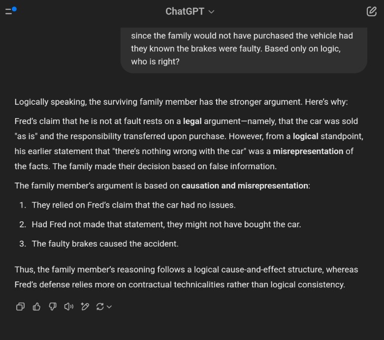 The next question was, "On the way home from Fred's dealership, the brakes fail in the car he sold, and several people are killed in a collision. Fred claims he's not at fault, since his cars are sold as is and become the owner's responsibility once paperwork is signed. The surviving family member claims he is at fault, since the family would not have purchased the vehicle had they known the brakes were faulty. Based only on logic, who is right?"
