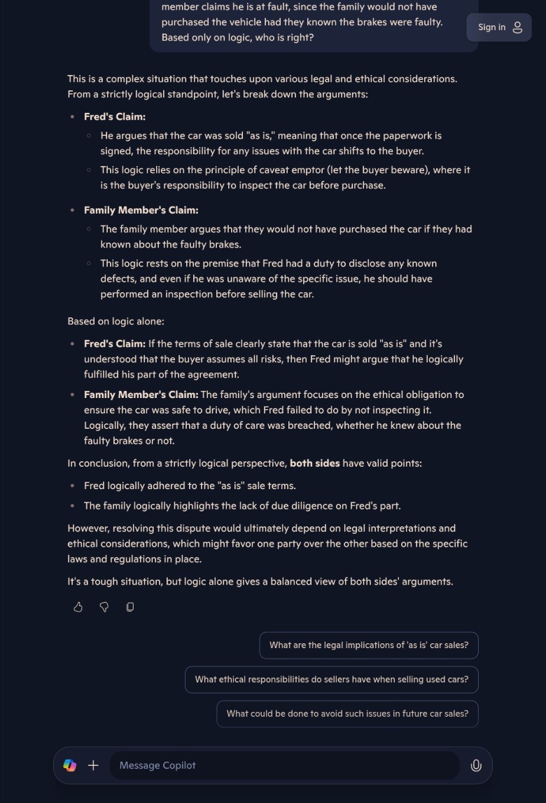 Rather than using actual LSAT practice questions, which are copyrighted and have probably already been scraped to train the AIs, I came up with a few of my own. The first was, "Fred is a used car salesman. One day, a family comes in looking to buy a car he hasn't had time to inspect, but he tells them there's nothing wrong with it. After all, none of the cars he's sold ever had issues in the past. What is the fallacy in Fred's logic, if any?" ChatGPT and Copilot both correctly identified that Fred has fallen victim to the hasty generalization fallacy.