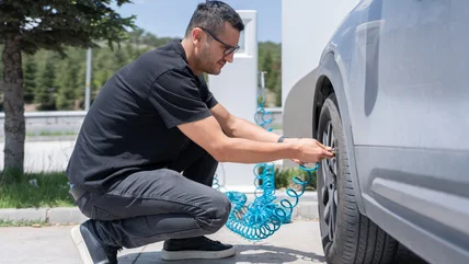 Tire maintenance is a broad category, and it includes everything from routine alignment and tire balancing services to keeping your tires clean and avoiding excessive exposure to direct sunlight. However, one of the most basic forms of tire maintenance is keeping the air pressure within the correct range. Performing this service is quick and simple, and if you have an air compressor, you can do it conveniently in your own driveway. If you don't have an air compressor, many tire and lube shops provide free tire top-offs, and various gas stations offer self-service tire filling stations.