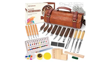 This 23-piece wood carving kit has whittling, detail, hook, and geometric knives, in addition to ones made for precise and focused detailing — perfect for small woodworking projects at a beginner level. The five detailing knives offer small flat, triangle, mid-semicircle, needle, and big oblique blades. Furthermore, you get all the woodworking essentials like polishing compound, gloves, a storage bag, and more.