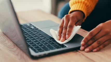 - Go over the keyboard, laptop edges, and the touchpad with the damp microfiber cloth.