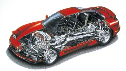 Powered by yet another major development of the 13B twin-rotor engine, the third-generation RX-7 used two turbochargers arranged sequentially, with one providing boost to the engine at lower rpms and the other cutting in at around 4,500 rpm to improve the high-end response. All told, this was enough to generate 255 horsepower at 6,500 rpm, with a redline placed at 8,000 rpm. Yet the entire RX-7 weighed only 2,850 pounds.
