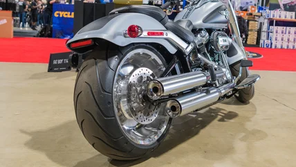 That being said, there are a couple of Harley-Davidson models that were officially released with fat rear tires. For this list, we've defined "fat tires" to mean any tires with widths measuring 240 millimeters or wider. These include models from the appropriately-named Fat Boy, as well as the Breakout line. On top of that, there are a few models that prove popular for fat-tire mods. Here, we focus on customized Fat Boy examples, although other Harleys are also commonly fitted with wide tires, such as the Night Rod Special.