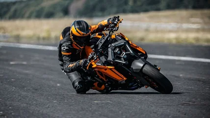 In terms of features, the bike has a WP Apex-USD 0 48mm suspension in the front and a WP Apex-Linkage Shock in the back, both of which use Semi-Active Suspension Technology (SAT). This allows the bike to adapt to both the rider's input and the traction the tires are getting from the road's surface. It also has cornering ABS, multiple ride modes, launch controls, wheelie control, a Keihin EMS (electronic monitoring system), a ride-by-wire throttle, cruise control, and a double ignition. It's definitely not the cheapest motorcycle that KTM sells, but no one can say it doesn't come with all the bells and whistles.
