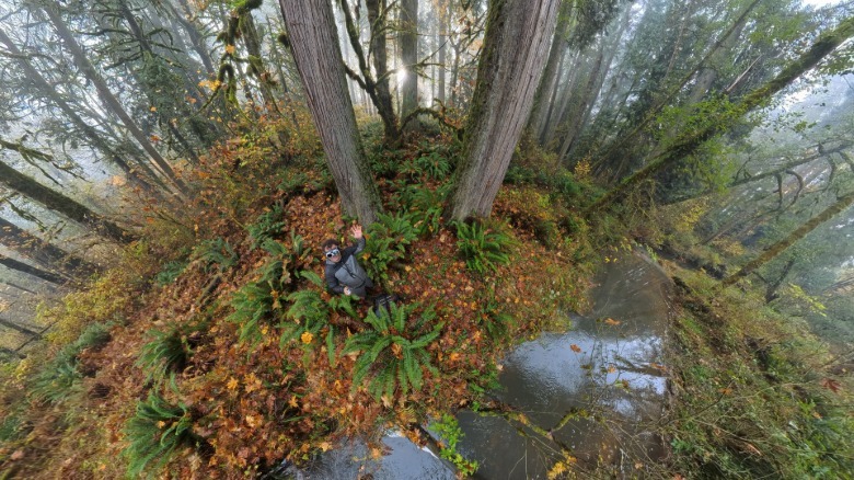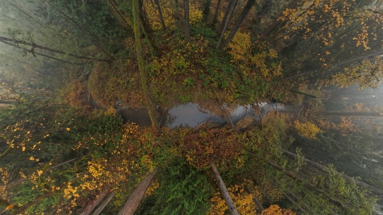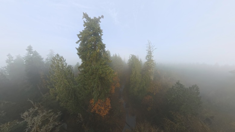 Take for example the following video, where I flew the A1 rather daringly through the fog above and below the canopy of a legacy forest in the early morning, all through thick fog lit by the rising sun. The A1 had to contend with the significant moisture in the air, the very strong light of the sun, and the dimly lit forest below. Once in the forest it was plunged into a complex environment with generally low light levels and a very bright sky overhead. These are some of the most difficult conditions possible for a 360 camera, and the A1 performed to a rather spectacular degree, only losing detail in the most extreme highlights of captured in the video.
