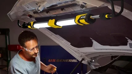 The Braun underhood light emits 2,000 lumens on its highest setting, and includes low and strobe settings with undisclosed outputs. The design incorporates padded underhood hooks that span up to 75 inches and a foldable frame that compresses to under 28 inches for storage. Harbor Freight reports its Braun 2000 Lumen Foldable Underhood Light comes with an integrated 7,200 mAh lithium-ion battery, with a battery gauge, that powers the light for up to 11 hours on low or 3 hours on high. In a review posted to Braun's product page, Mike, a Harbor Freight customer, says the light lasted for 6 hours after receiving a full charge.