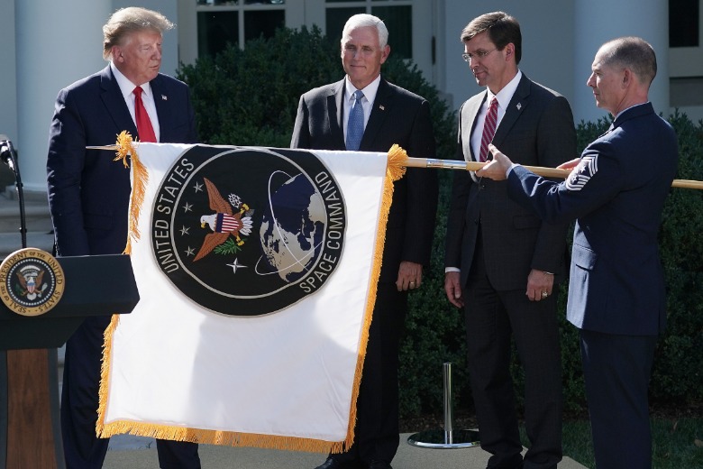 Above you'll see the United States Space Command logo (flag) as it existed from the year 1985 until 2002. On the right you'll see the "new" Space Command flag as revealed in December of 2019, as captured in the Getty Image below. These have a little less to do with Star Trek, and more to do with a peaceful transition of workforce.
