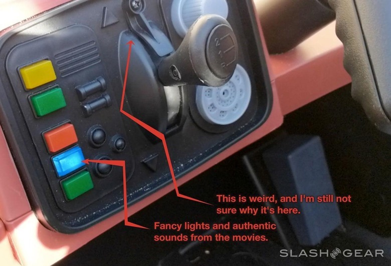 In the cockpit are a set of colorful buttons that activate sounds from the movies. In our tests, the sounds weren't so extremely loud as to be heard by people outside the Landspeeder while the Landspeeder is in motion. These sounds were able to be heard by everyone inside the moving vehicle just fine. You can hear the whole collection of sounds over at Radio Flyer right this minute.