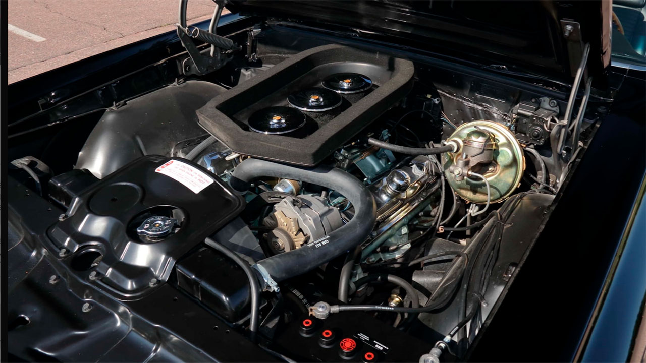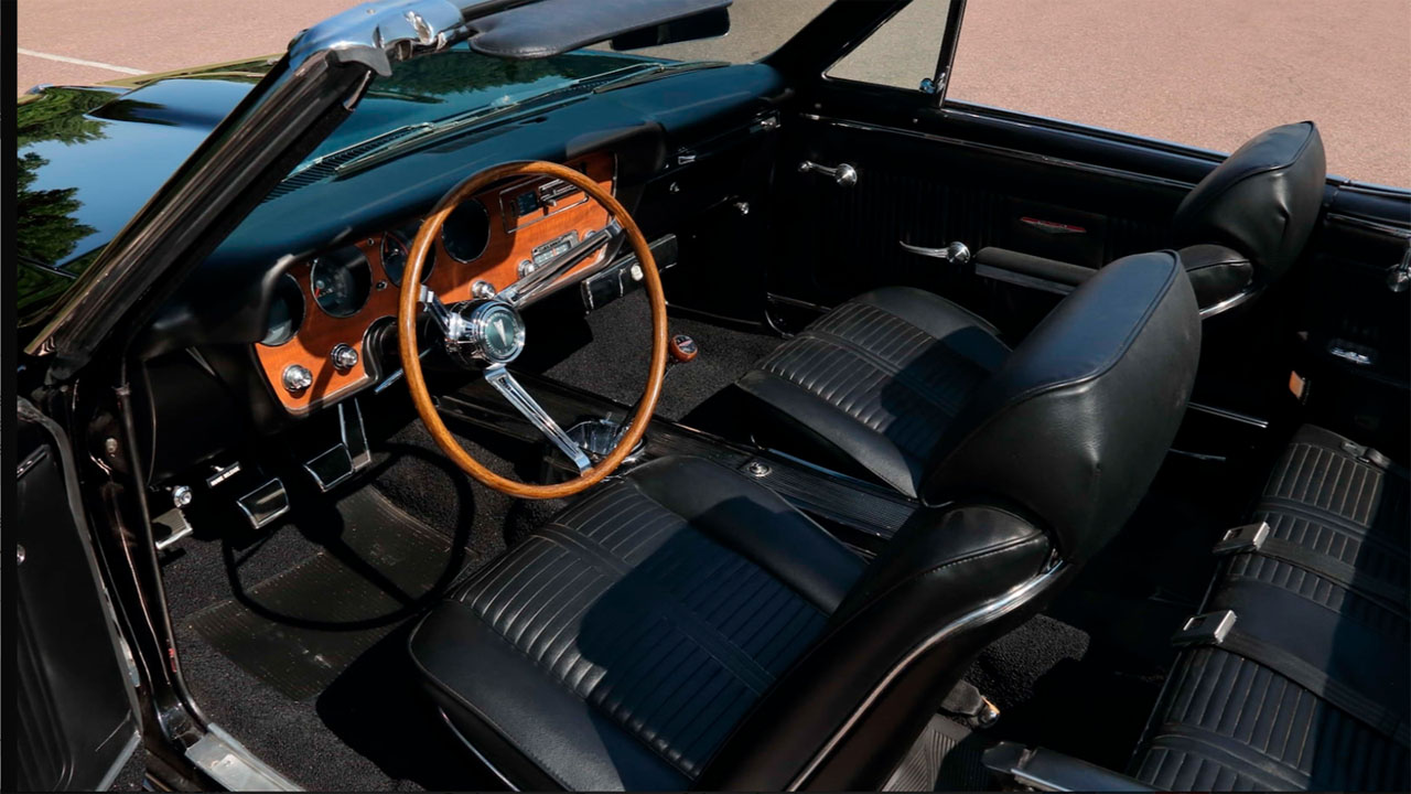 It's paired with the original four-speed manual transmission. The car also has Hurst wheels with Gladiator spinners and Saf-T-Track 3.55 differential. The factory paint scheme for the car is a highly desirable triple black featuring a black exterior, black interior, and black convertible top. The steering wheel is a wooden sport steering wheel with a matching shift knob.