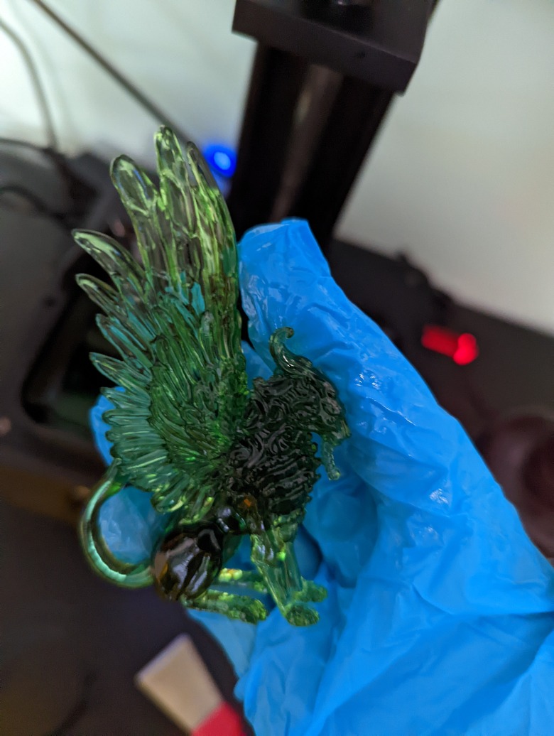 Printed Obsession's STL file (the 3D model that we gave to the Photon Workshop program) came professionally pre-supported, so all I had to do was put on a glove and gently snap some of the supports with my fingers where they meet the model, then gently rock it back and forth to free the Sphinx from its spikey imprisonment — that's much easier than clipping models from sprues.