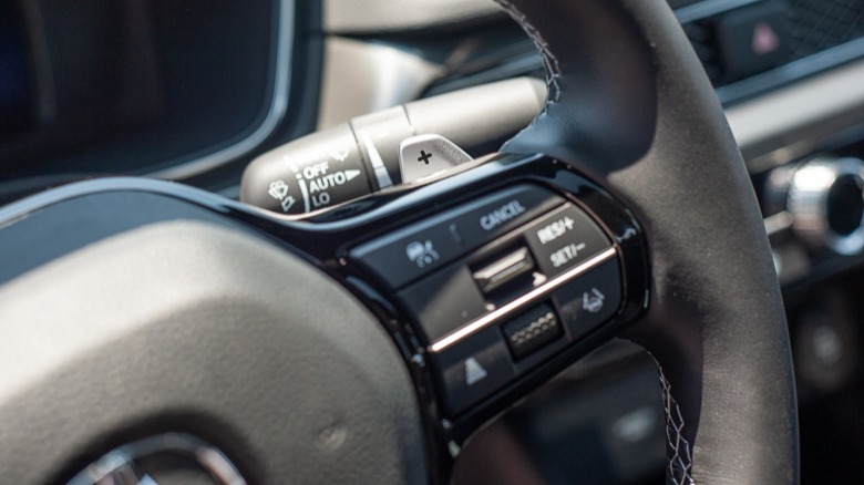 The CVT also gets paddle shifters, which ping the transmission to seven preset gear ratios. In manual mode, the artificial shifts are still completely numb. You feel like you're driving the Integra in a video game, with the digital tach jumping all over the place. The auto gear selector and paddle shifters also feel cheap and plasticky, which stuck out to me compared to the nice shifter on the 6MT.