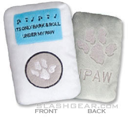 Well dog owners, if you are into iPods, then your pets should get this. It's an iPod plushie for dogs, it similar to the looks of an iPod, with the paw imprint on the scroll wheel. It doesn't play MP3s, but it does gives squeaks. It retails for $10.50. Get one!