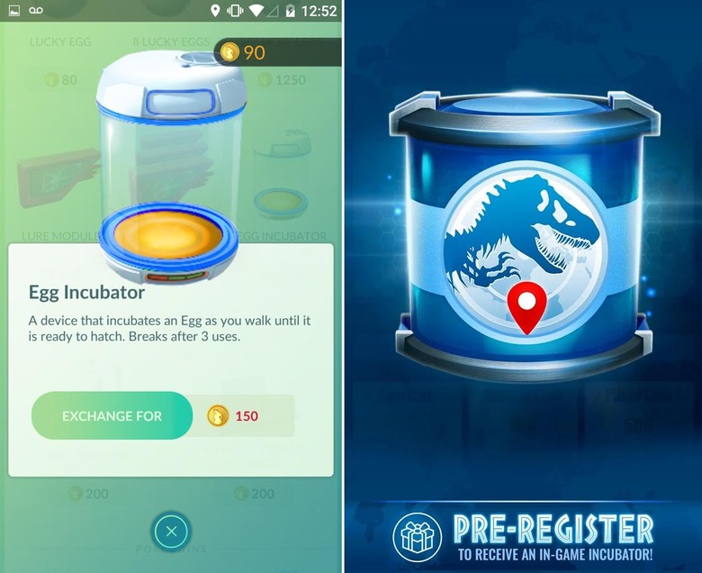 ABOVE: In-game incubators for in-game collectable creatures. We don't yet know for certain if the exact same game mechanics will be used here, but given the egg hatching nature of dinosaurs in the Jurassic Park / World movies, there's a pretty good chance these incubators will be basically the same as they are in Pokemon GO.