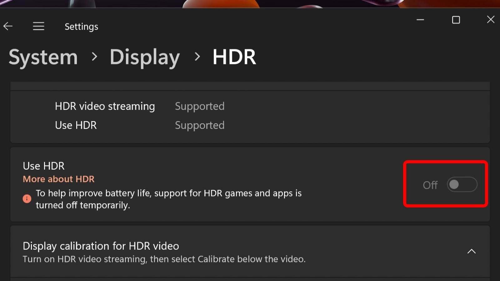 - If your laptop is already in a balanced or battery saver mode, HDR will likely be disabled by default. If it is turned on, however, you can manually turn it off to save battery life by clicking the toggle switch.