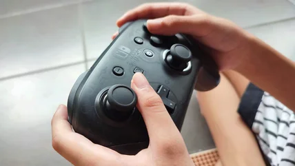 The Nintendo Switch Pro Controller features the tiny code "THX2ALLGAMEFANS" printed in white letters inside of the housing — written normally, it reads, "Thanks to all game fans." The message appears to be a sentiment shared by Nintendo to everyone who has purchased its consoles and played Nintendo games. You can only see the phrase if you hold the controller at the right angle and pull the right joystick all the way down.