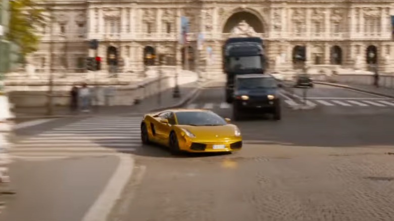 Not to be outdone, the little Alfa is seen driving next to an incredibly ostentatious Lamborghini Gallardo in a reflective gold wrap. In reality, the V10 powerplant in the Gallardo would wipe the floor with the classic Alfa, but that wouldn't make for a very fun chase scene.