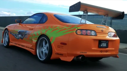 Eight orange Supras were used in 2001's "The Fast and the Furious" throughout the filming. One was the hero car with modified engine parts, one was a backup for the main car but only on the outside, and six were stunt doubles. This is the 10-second car that Brian owed Dom, the wheels that set the franchise up for its never-ending road race. The 1994 Supra cost $24,000 new and received extensive customizations to almost every part of the car. The engine was filled with custom parts from Greddy, HKS, Turbonetics, and NOS, bringing 544 – 569 horsepower before nitrous (the range is because it was tested on two dynos, with differing results). The exterior got a makeover with that sweet neon orange and custom Troy Lee graphics, the tires and suspension got upgraded, the interior was decked out in carbon fiber and blue suede, and a roll cage was added.