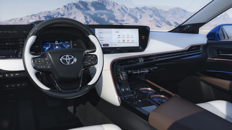 The Mirai rests on Toyota's rear-wheel drive GA-L sport sedan platform and is powered by a single 182 horsepower AC electric motor that produces 221 foot-pounds of torque. The interior of the FCEV sports a 12.3-inch infotainment screen for all of your music/navigation needs. That infotainment system and even the climate control can be controlled by Toyota's own voice-activated assistant, much like a smartphone or Amazon Alexa device.