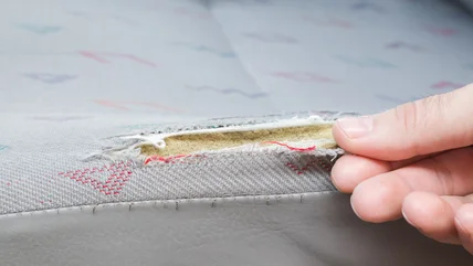 The simplicity and quality of fabric car seat tear repair will depend mostly on your sewing skills. Luckily, as long as you're willing to exercise patience, you should be able to repair most fabric car seat tears with good results. Head to a craft store and pick up a curved upholstery needle, thread, as well as liquid seam sealant. For larger holes, you'll need fabric scraps that match your car seat's color as well as material, and some type of adhesive (iron-on adhesives are recommended).