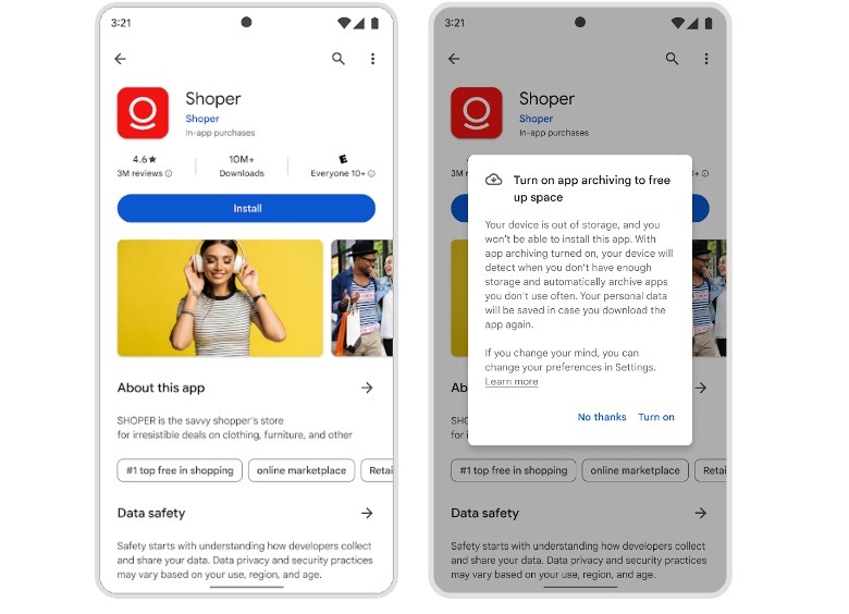 The auto-archive feature will only show up when you try to download a new app on an Android mobile device that is completely out of storage space. In addition, the developer behind the app you're trying to download needs to have auto-archive support enabled on their end by using App Bundle to publish their projects. For newer apps, this shouldn't be an issue as app developers have been required to use the format since August 2021.