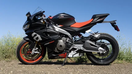 I swing my leg over the high tail of an Aprilia RS660 in front of Moto Club Santa Monica. Multiple drivers stuck in bumper-to-bumper traffic watch me the whole time and this is my first true sport bike, so a bit of nerves almost start to set in. Well, to be fair, I learned how to ride on the road with a Kawasaki Ninja 400 after a childhood on dirt bikes—the Ninja is a great little tool for beginner lessons, but a far cry from this piece of Italian exotica.
