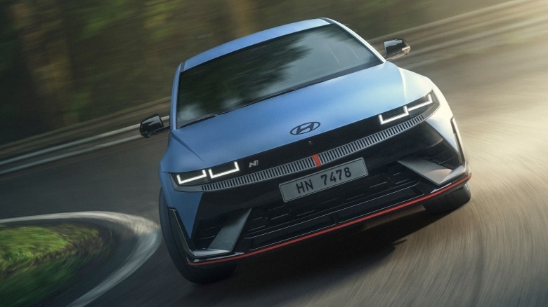 Lastly, there's Everyday Sportscar. The Ioniq 5 N wouldn't be too exciting of a prospect to your average buyer if it wasn't fun to drive on the road. EVs have the benefit of more efficient power delivery to the wheels by forgoing a conventional transmission entirely, at the sacrifice of the "feel" that many people are used to when rowing through gears. The Ioniq 5's N e-shift capability simulates an 8-speed dual-clutch transmission like you would find on the gas-engine powered Hyundai Elantra N. Plus, the car is able to pipe in "not only a futuristic EV sound but also ICE-like engine and exhaust sounds" through the speaker system if you find the normal driving soundtrack too boring.