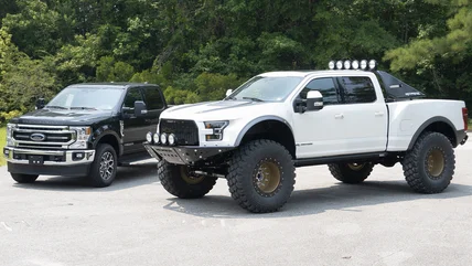 Not many vehicles give a good viewing angle of a Ford F-150 Raptor's rooftop. And yet, driving around the swamps of North Carolina in a MegaRexx MegaRaptor, I looked down at the tops of Raptors, Ram duallies, TRXs, and even F-550 work trucks alike. That's because the MegaRexx starts with an F-250 Super Duty and then transforms the production pickup truck into the closest thing to a trophy or monster truck still legal to drive on public roads.