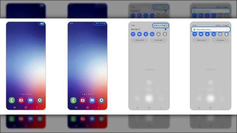 Whenever an app on your Galaxy phone is actively utilizing either your camera or microphone, the green dot will appear in the top-right of your display, distinct from the rest of your notification bar. When the dot first appears, it'll show a camera symbol for the camera, and/or a microphone symbol for the microphone.