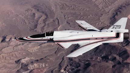 The aeronautical advancement that has taken place between the Wright Brothers' fateful flight and today could not have been so spectacular without the kind of experimentation that attempts to rewrite the book on what is possible in the air. The X-29 typifies such bold innovation. One look at this unique creation is all you need to realize you are looking at the very far end of aircraft design. The wings look like they were put on backwards, and there is an extra set of what look like vestigial wings right behind the pilot. These forward-swept wings and canards, as the mini-wings are called, along with the small horizontal surface behind the main wings (known as a strake) were part of a design that sought to minimize drag in the plane's flight without sacrificing stability.