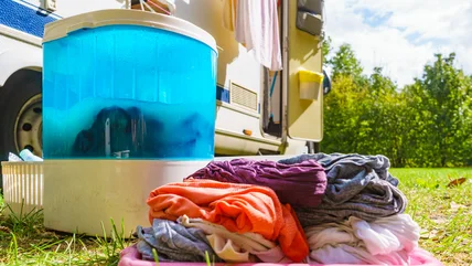 The Super Deal portable washing machine is easy to install, durable, and light enough to move around easily. This also makes it a great option to take on your RV trip. On the flip side, it has a small capacity, so the washer might not agitate if you overload it. Additionally, since the spinner is smaller than the washer, you'll need to run it multiple times to dry the entire load.