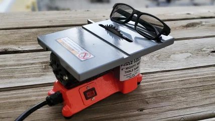 Ultimately, it's easier to explain what the tiny table saw offers rather than what it lacks. It has a vertical 4-inch blade that you can replace with other 4-inch blades. The power button is a red switch on the front. The table top is secured by a knob on the right-hand side. The product sticker on the front is deliberately placed so that it's easy to peel off. And to its credit, the paint job on the table saw feels like thick, durable enamel.