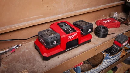 The Milwaukee M18 Dual Bay Simultaneous Super Charger has slots for two M18 batteries and claims a sixfold increase in charging speed, powering an M18 6.0 Ah battery to 80% in just 15 minutes. Lastly, users of Milwaukee's MX Fuel Super Charger, built for the beastly battery line that powers heavy-duty tools like jackhammers and concrete saws, will get two times the charging speed.
